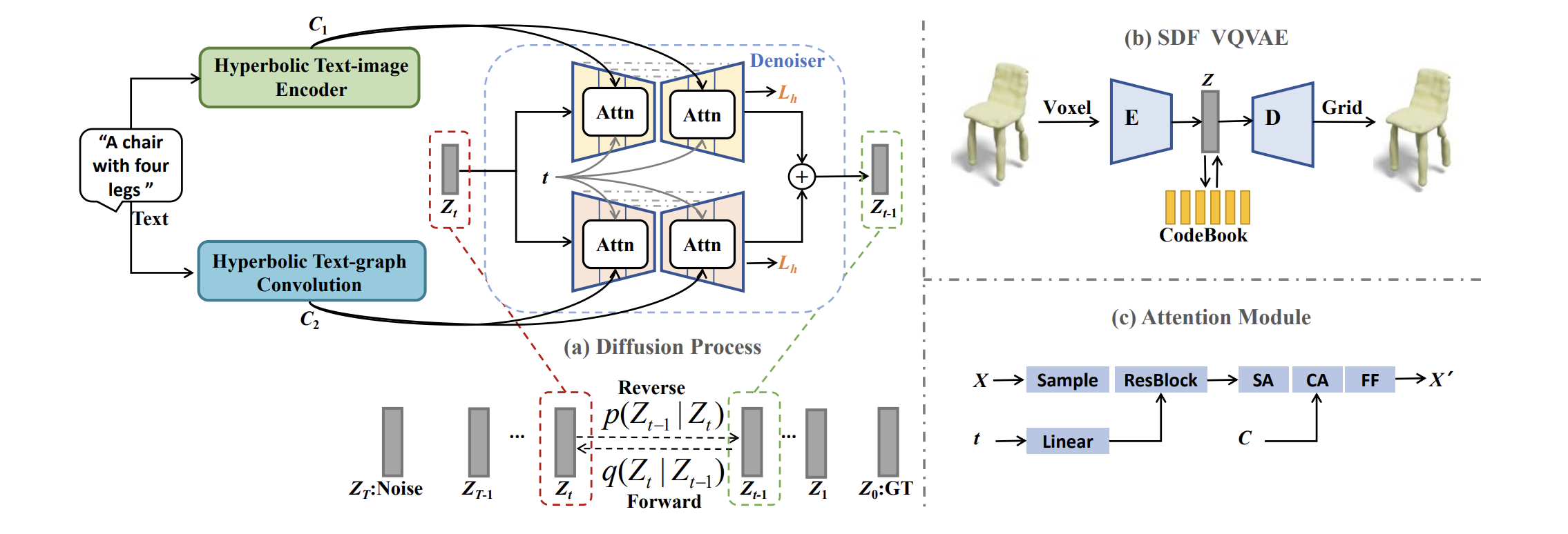 - Approach: we propose to learn the hierarchical representations of text and 3D shapes in hyperbolic space